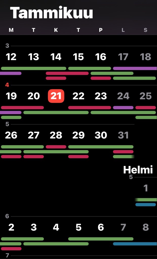 Kalenteri näyttää tältä, vihreä on majoitus ja punainen bussi/juna/laiva. Violetti (vuokra-)auto.