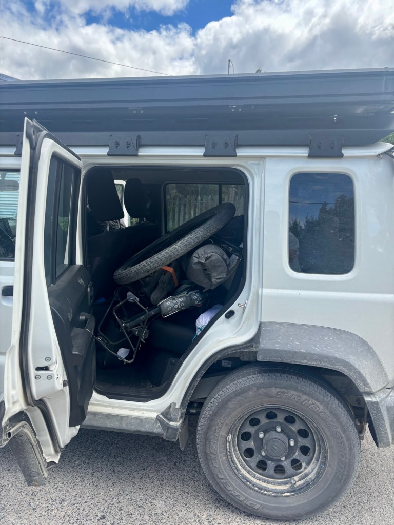 Pyöräilijä oli ollut edellisen yön samassa kylässä, ja korjauttanut hajonneen menopelinsä paikallisella kyläsepällä. Pääsi muutaman kilometrin, ja oli liftannut jo 3 tuntia. Seuraavassa kylässä olisi pätevä alan liike, matkaa 120 kilometriä eikä huvittaisi taluttaa pyörää sinne asti. Ymmärrettävää. No, tsygä palasiksi ja jollain ilveellä se saatiin mahtumaan takapenkille.