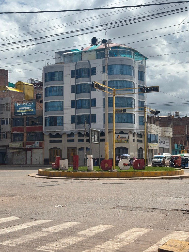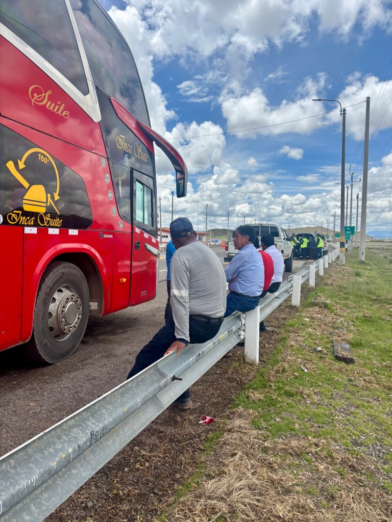 Pääsin sentään pihalle jaloittelemaan, toinen matkustaja tiesi kertoa että etsivät laitonta tavaraa. Ei pelkästään huumeita, myös elektroniikkaa, kultaa yms. Ollaan keskellä Perua, ei lähelläkään rajaa. Aika tovi ollaan jo jumitettu checkpointilla. Jännä nähdä milloin matka jatkuu.